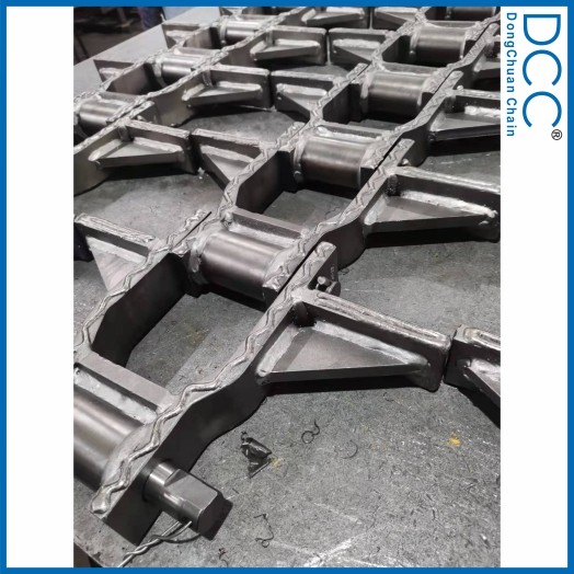 鏈條的刮板與鏈板焊接后又增加了一塊加強(qiáng)板,大大提高了刮板與鏈板的焊接強(qiáng)度,在鏈條的使用過程中,能使刮板長(zhǎng)期承受較高的沖擊載荷而不脫焊。