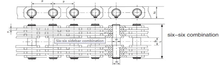 | Chain no. | Pitch P (mm) | Inner width of inner link b1 (max.) (mm) | Diameter of pin (max.) (mm) | Length of pin L (max.) (mm) | Height of sidebar h2 (max.) (mm) | Thickness of sidebar T (mm) | Combination of sidebars n*n | Allowed working tension (KN) | |