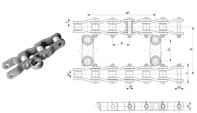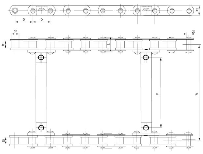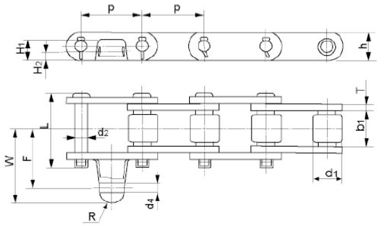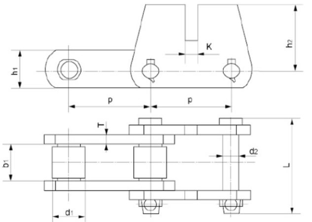 節(jié)距 P (mm) | 內(nèi)節(jié)內(nèi)寬 b1 (mm) | 滾子直徑 d1 (min.) (mm) | 銷軸直徑 d (mm) | 銷軸 長(zhǎng)度 L (mm) | 鏈板高度 h1 (max) (mm) | 鏈板厚度 T (max) (mm) | 附件尺寸 | 抗拉強(qiáng)度Q (min) (KN) | |