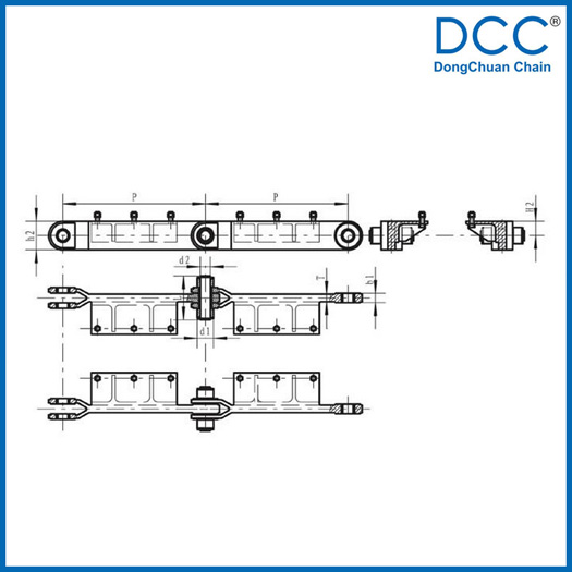 Chain No.Pitch P (mm)Inner width of inner link b1 (mm)Diameter of roller d1 (mm)Diameter of pin d2 (mm)Height of sidebar h2 (mm)Thickness of sidebar T (mm)Height of platform H2 (mm)Tensile strength Q (KN)